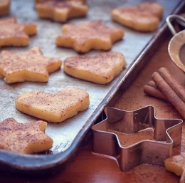 3 Pekač obložimo s peki papirjem, pečico predgrejemo na 180 stopinj Celzija. Delovno površino malo pomokamo in na njej razvaljamo testo na približno 0,5 cm debelo testeno ploščo. Z različnimi modelčki (zvezdice, srčki, lunice …) izrežemo kekse, ki jih polagamo na pekač.