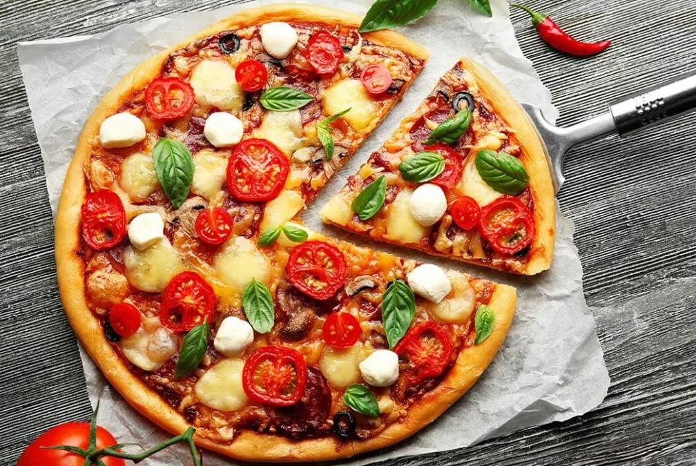 3 Vzhajan hlebček razdelimo na polovico in oblikujemo v 2 kroglici. Pečico segrejemo na 250°C, oziroma na najvišjo možno temperaturo. Testo raztegnemo in pizzo obložimo s sestavinami po želji. Pečemo jo v segreti pečici 10 minut, oziroma toliko, da se rob in dno lepo rjavkasto obarvata. Čas pečenja je odvisen od temperature v pečici.