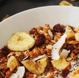 2 Granolo pečemo 10 min na 175 °C, nato premešamo in pečemo še 10 min. Granolo ohladimo, ji primešamo ostale sestavine in shranimo v steklenih, nepredušnih kozarcih.