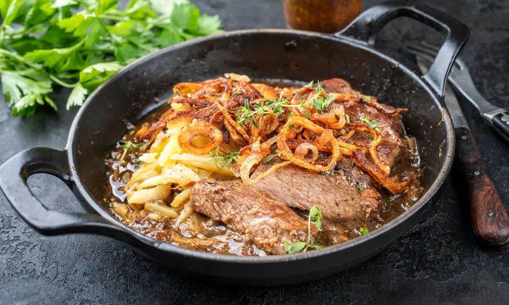 3 V isti ponvi, kjer smo pekli zrezke, stopimo 2 žlici masla. Dodamo narezano čebulo in pražimo na srednjem ognju približno 10 minut, dokler čebula ne postane mehka in rahlo karamelizirana. Dodamo še česen, pražimo še minutko, da česen zadiši.