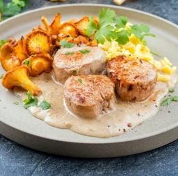 2 Ponev s čebulo odstavimo z ognja, dodamo moko in vodo, vrnemo na štedilnik in hitro mešamo, da se ne naredijo grudice. Ko se zgosti, dodamo smetano za kuhanje in kislo smetano. Še malo pokuhamo, da zavre ter postrežemo.