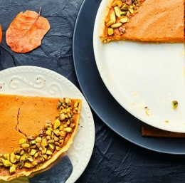 5 Pistacije grobo nasekljamo, lahko jih zamenjamo z bučnimi semeni ali drugimi oreščki in potresemo pri robu pite. Postrežemo jo lahko mlačno ali hladno.