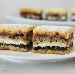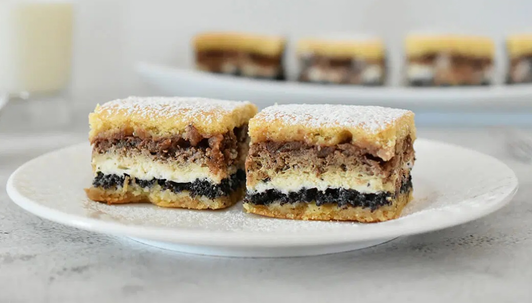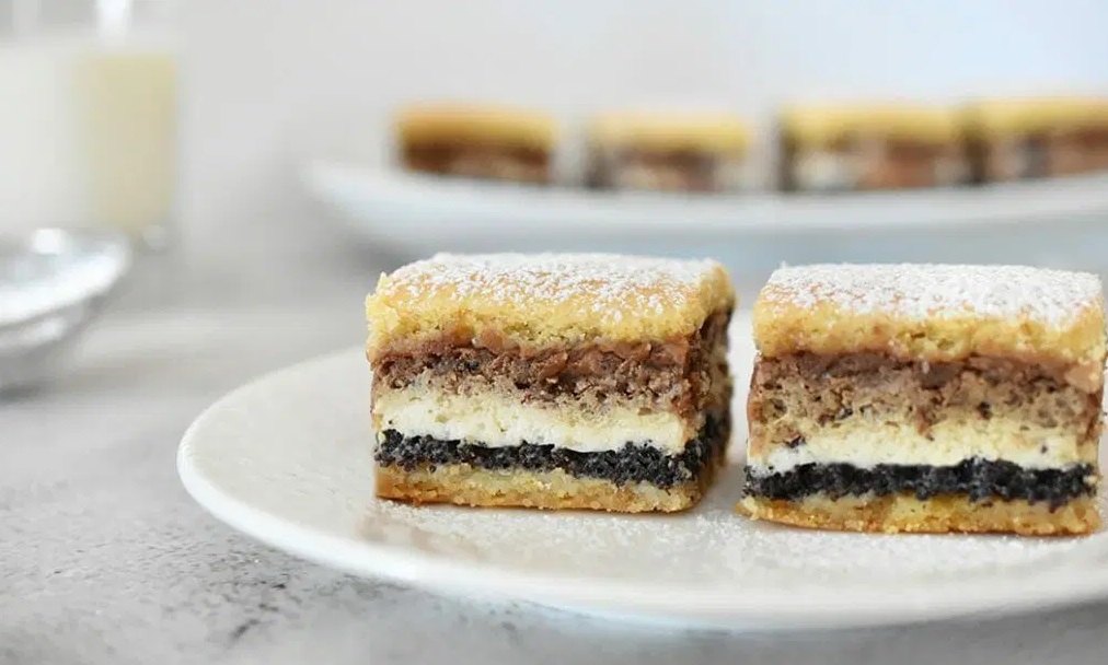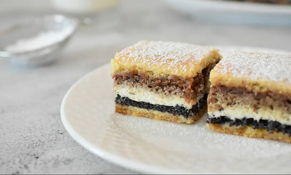3 Testo enakomerno premažemo najprej z makovim nadevom, nato s skutinim, orehovim in nazadnje še jabolčnim.