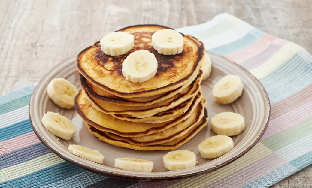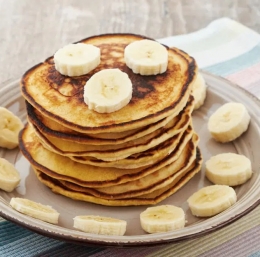 2 Nato spečemo palačinke velikosti dlani. Po želji lahko za okras uporabite tudi jogurtovo ali skutno smetano s sadjem ali jih pa samo okrasimo s koluti narezane banane.