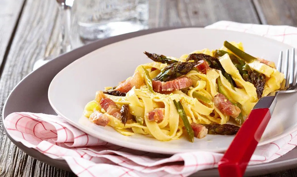 400 g jajčnih rezancev 300 g divjih špargljev 2 šalotki 200 g pancete 4 jajca 50 g naribanega parmezana sol in poper po okusu 2 žlici oljčnega olja