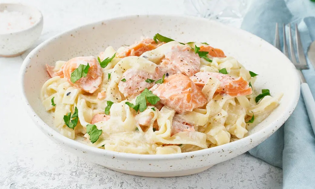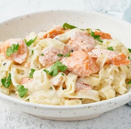 3 Svežega lososa narežemo na manjše kose in ga popečemo na 2 žlicah olja. Ko je pečen, mu dodamo na koščke narezanega prekajenega lososa, na hitro premešamo (toliko, da losos ni več rožnat), dodamo sesekljan česen in zamešamo belo omako. Postrežemo s testeninami.