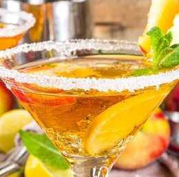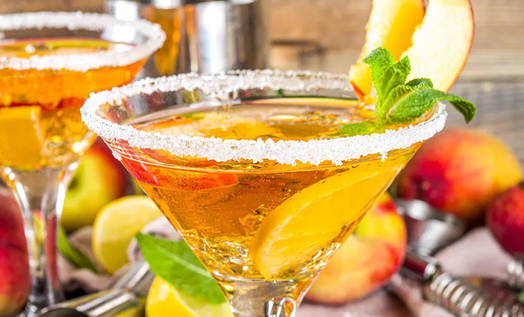 4 do 5 kock ledu 4,5 cl vodke 3,0 cl breskovega žganja sladkor in rezine breskve za okras