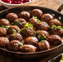 6 V omako vrnemo mesne kroglice in jih skupaj z omako kuhamo še 5 minut. Končano jed po želji potresemo s svežim nasekljanim peteršiljem in zraven ponudimo brusnično omako, če nam je všeč.