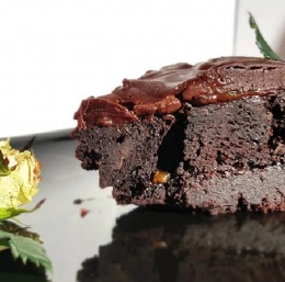 2 V stekleno skledo nalomimo temno čokolado, dodamo maslo in oboje stopimo nad vodno kopeljo. V čokoladno zmes vmešamo še sladkor (količino sladkorja lahko tudi zmanjšate, ne bo nič narobe), sol in vaniljo. Na koncu na hitro v maso vmešamo še stepena jajca in kakav. Zmes vlijemo v pekač in pečemo v segreti pečici 25 minut.