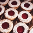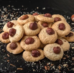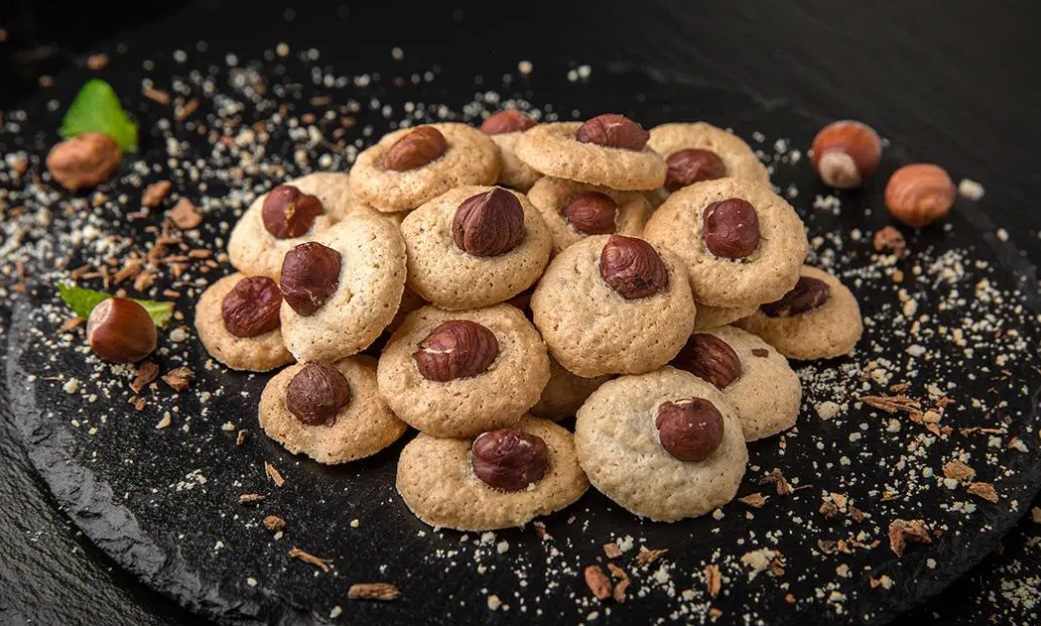 2 Pečico segrejemo na 200 °C. Pladenj obložimo s peki papirjem. Testo narežemo na kolobarje in te na čim bolj enakomerne kocke. Z rokami oblikujemo kroglice in jih polagamo na pekač. Vsako kroglico na vrhu namažemo z rumenjakom in nanj pritisnemo cel lešnik.