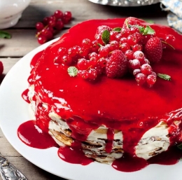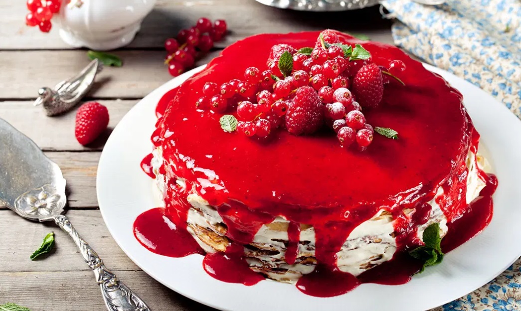 Ribez in maline zmiksamo s paličnim mešalnikom v gladko zmes. Na močnem ognju jo kuhamo par minut, da se preliv nekoliko zgosti. Če želimo bolj gost preliv, dodamo žličko krompirjevega škroba, ki ga prej zmešamo z malo soka iz lonca. Še vroč preliv polijemo po palačinkah, okrasimo jih s svežim sadjem in posujemo s sladkorjem v prahu.