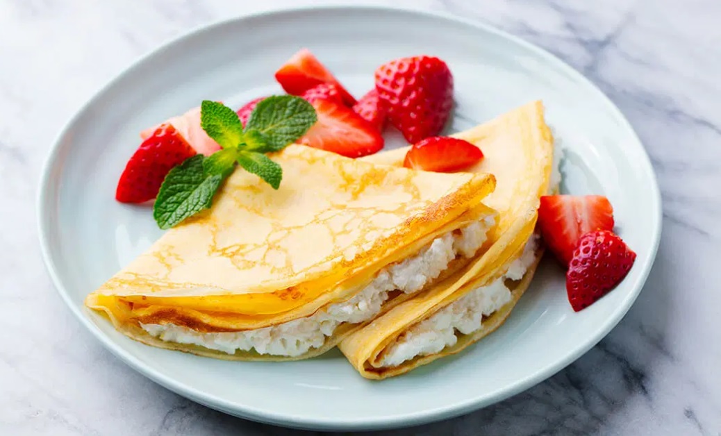 Pečene palačinke namažemo s skuto, prepognemo v trikotnik in potresemo s svežim sadjem, recimo jagodami in takoj postrežemo.