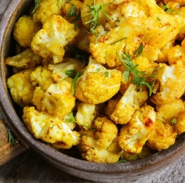 3 Tako pripravljene cvetke porazdelimo po pekaču. Pekač porinemo v segreto pečico. Pečemo 10 minut, nato premešamo/preobrnemo z lopatico ali žlico in pečemo še približno 10 minut, da se cvetača lepo zmehča in hrustljavo zapeče.