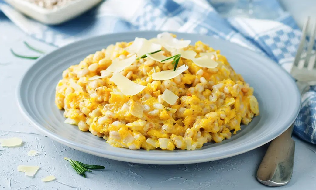 Sestavine 300 g ješprenja 1 kg težka buča 1 l vroče zelenjavne jušne osnove 1 čebula 2 stroka česna 1 vejica svežega rožmarina 3 žlice oljčnega olja 60 g naribanega parmezana + 50 g narezanega na tanke lističe sol in poper