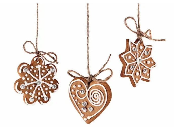 Nekaj piškotov pred peko na vrhu preluknjamo, da bomo lahko vstavili vrvico in mimogrede spečemo še okraske za smrečico.