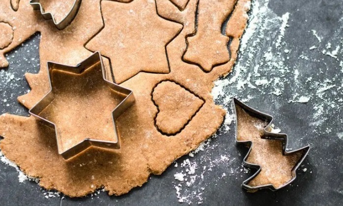 Vzamemo polovico testa (drugo pustimo v hladilniku) in ga na pomokani površini razvaljamo na 1 cm debelo ploščo. Testo se bo nekoliko lomilo na robovih, zato kar s prsti popravimo razpoke. Iz testa izrežemo piškote različnih oblik.