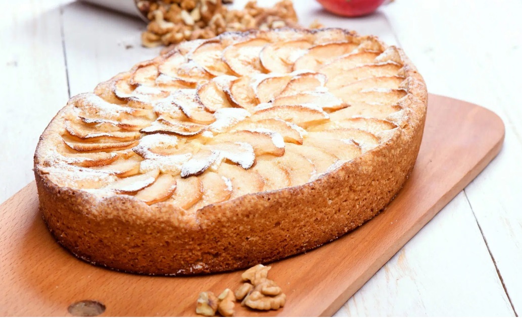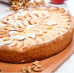 Jabolki olupimo in ju narežemo na tanke rezine oziroma krhlje. V krogu jih naložimo po vrhu testa, jih potresemo z mešanico sladkorja in cimeta, damo v pečico in pečemo 40-45 minut na 180 °C.