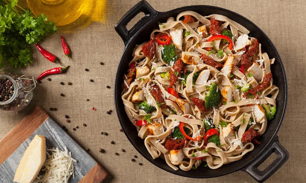 200 g ajdovih rezancev ½ piščančjih prsi 150 g brokolija 10 suhih paradižnikov 1/2 rdeče paprike 1 čili (ali čili v prahu) 50 g parmezana oljčno olje sol in poper 2 stroka česna