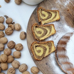 Pečeno potico pustimo v pekaču, da se nekoliko ohladi, nato jo zvrnemo na desko in potrosimo s sladkorjem v prahu.