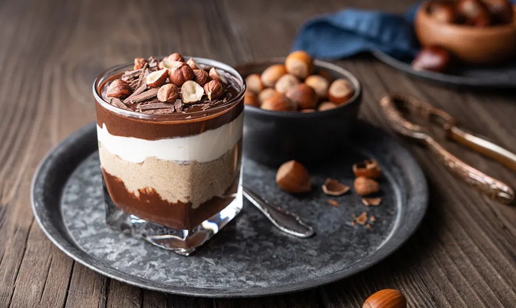 Sladico postavimo v hladilnik za 1 uro. Preden jo postrežemo, jo okrasimo z grobo narezanimi lešniki in čokolado.