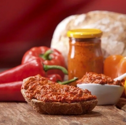 20 rdečih in rumenih paprik 2 mali čebuli 5 strokov česna 1 žlica soli 1 žlica sladkorja 1 dl jabolčnega kisa 1 dl vode 2 dl oljčnega olja 250 g gorčice 2 žlici paradižnikovega koncentrata mleti črni poper po okusu (1/2 čajne žličke ali več)