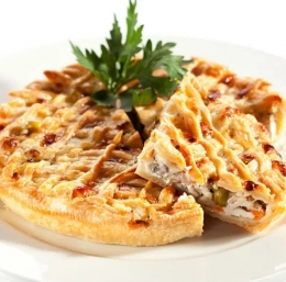 Piščančje prsi:Piščančje prsi imajo nežen in nekoliko sladek okus. Ko so kuhana in narezana na majhne kose, postanejo sočna in mehka, kar obogati okus pite in dodajo beljakovine.