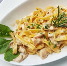 200 g piščanca 30 g masla 400 g rezancev 180 g gorgonzole 150 ml navadnega jogurta 90 ml mleka 50 g mletih orehov 30 ml limoninega soka sol poper