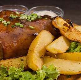 Kračo postavimo iz pečice na desko, pustimo počivati vsaj deset minut in jo narežemo. Postrežemo skupaj z zelenjavo in krompirjem, ki sta se pekla poleg krače, in polijemo s sokom od pečenja.