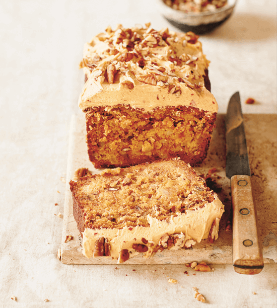 100 g zmehčanega masla 125 g sladkorja v prahu 1 žlica ananasovega soka iz pločevinke 1 žlička mletega cimeta 1 žlička rožne harise nasekljani ameriški orehi (pekani) za okras