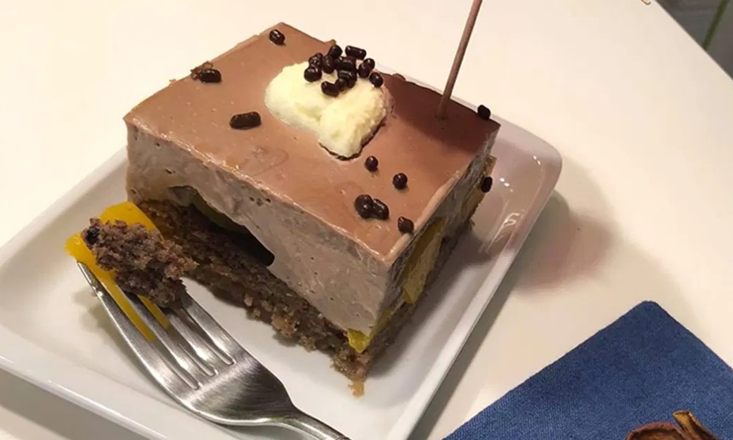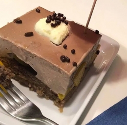 Prek testa položimo na koščke zrezane breskvice. Mi smo uporabili breskov kompot, lahko pa tudi katerega drugega. Pomembno je le, da je sadje sočno. Skuhamo dva pudinga (glede na okus lahko izberemo čokoladnega ali vanilijevega) v 8 dcl mleka, v kuhan puding vmešamo 250 g mascarponeja.