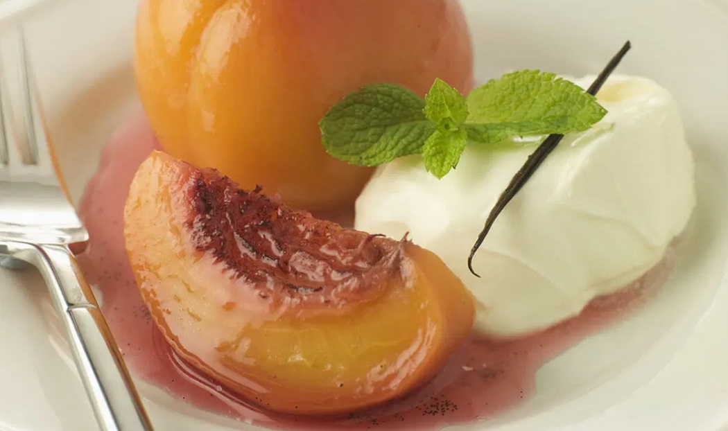 V posodo, ki je dovolj velika za 4 breskve, vlijemo vino in med, dodamo še vaniljev strok, ki ga prerežemo na pol. Pri zmerni temperaturi segrevamo, da se med stopi. V lonec damo breskve, pokrijemo in jih kuhamo 15-20 minut. Breskve morajo biti skuhane, vendar še vedno čvrste. Vmes jih parkrat obrnemo in polijemo s tekočino, v kateri se kuhajo.