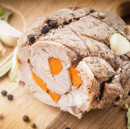 V zarezo vložimo korenček, ki smo ga skuhali v goveji juhi. Potem v meso zataknemo še nageljnove žbice, notranjo stran pa obložimo s tankimi rezinami limone, zelo tankimi lističi česna, peteršiljem in zdrobljenim lovorovim listom.