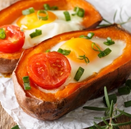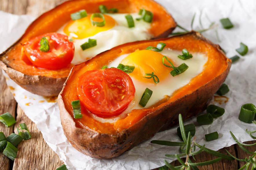 V sladkem krompirju pečeno jajce je zdrav obrok, ki vam bo dal dolgotrajen občutek sitosti, saj je bogat z vlakninami in proteini.