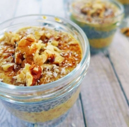 Nato napolnimo kozarčke v plasteh: chia semena, nadev, chia semena, nadev … Lahko dodamo še malo maka, ki je zelo okusen – posujemo ga po chia semenih, pred nadevom.