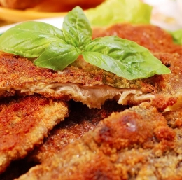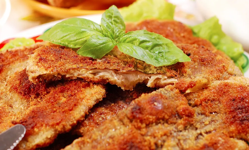 V skledi razžvrkljamo jajca s soljo, poprom in parmezanom. Na večji krožnik natresemo drobtinice. V široki ponvi segrejemo olje za cvrtje na približno 170°C.
