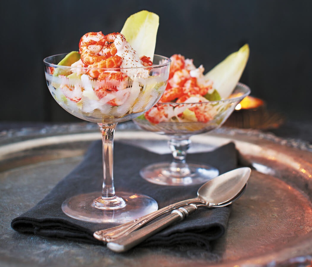 Ljubitelji morja tudi za praznike ne morejo brez morskih dobrot. Ko sestavimo tale šik koktajl z rakci, zraven ponudimo še kaj drugega iz morskih globin: priskrbimo si res dober bakala na belo (ali kak drug morski namaz), dimljenega ali mariniranega lososa, kaviar in slanike … Pa hrustljav kruh in nekaj zelenega.