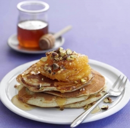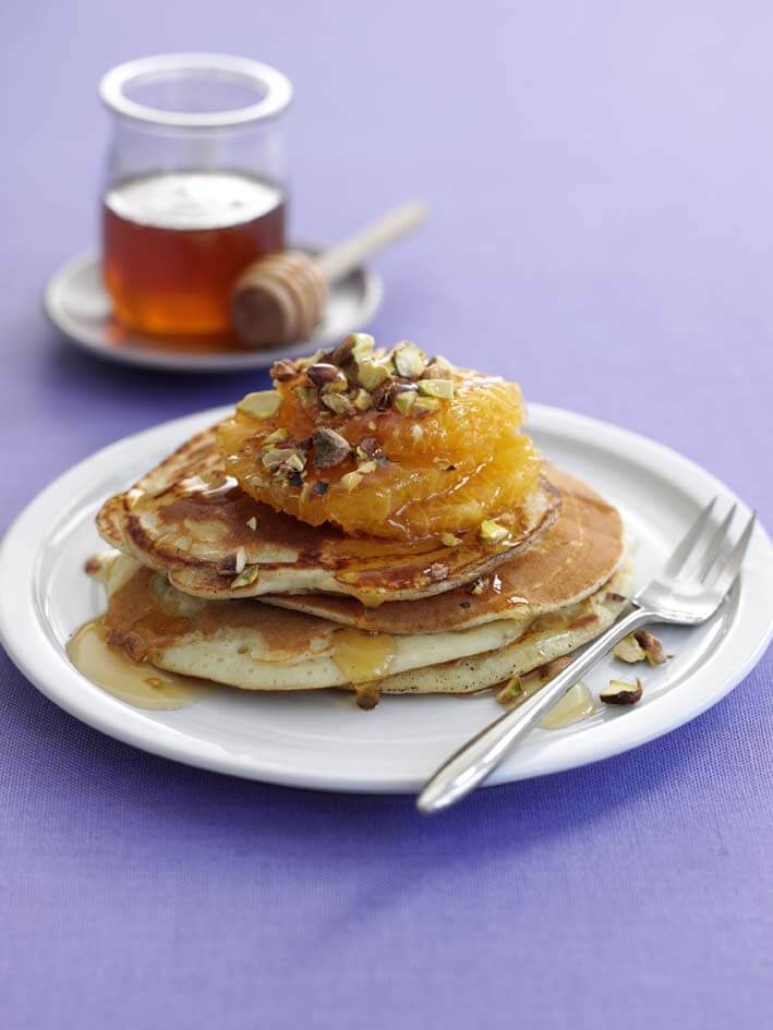 Palačinke razdelimo na dva krožnika, jih obložimo s pomarančnimi rezinami, prelijemo z medom, posujemo z grobo sesekljani pistacijami in še tople postrežemo.