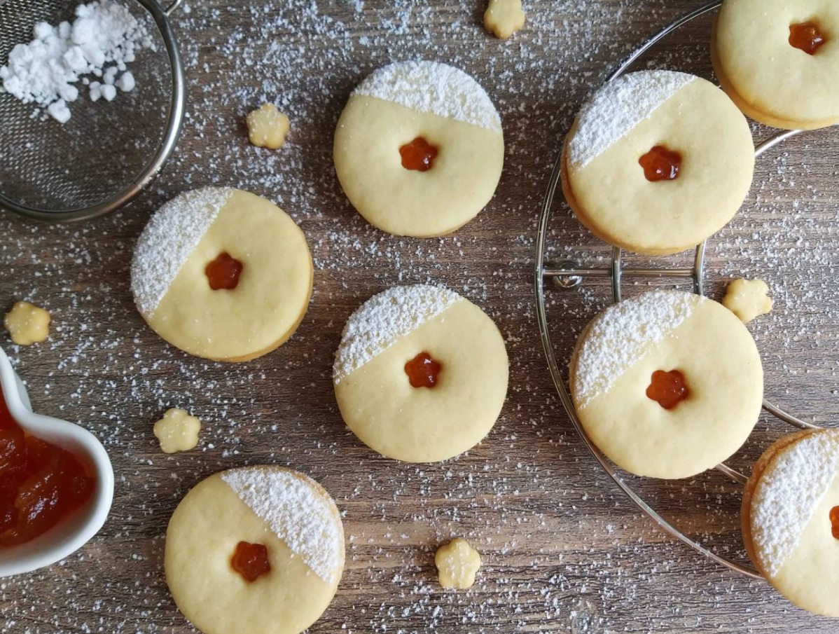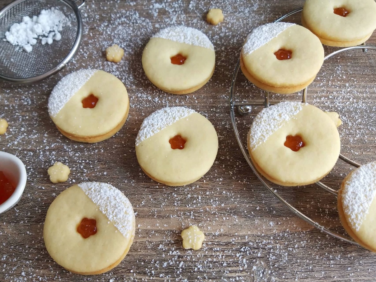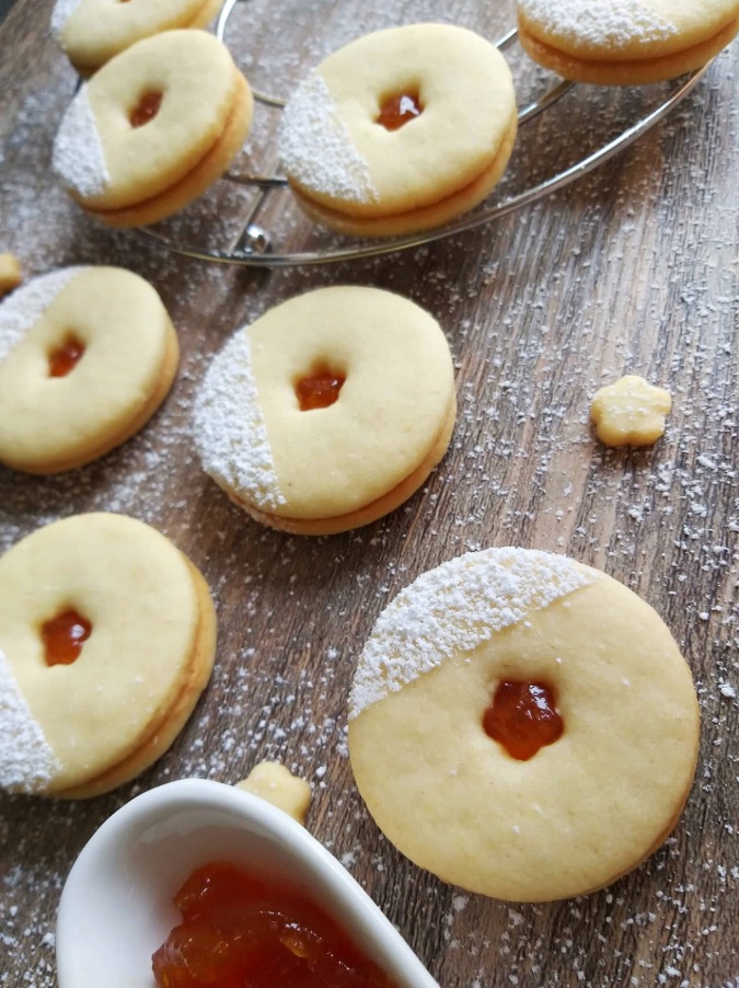So krhki in ravno prav sladki. Piškotno testo vsebuje nekaj mandljev, ki okus klasičnih piškotov rahlo popestrijo. Uporabite lahko olupljene ali neolupljene mlete mandlje. Jaz sem uporabila kar mandljeve lističe, ki sem jih zmlela v mlinčku za kavo. V sredini se skriva še marmelada. Moji so polnjeni z marelično, po okusu pa jo lahko zamenjate s katero koli drugo marmelado.
