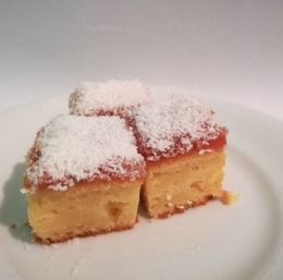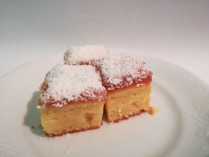 Nato maso vlijemo v pekač in posujemo s sadjem (po želji). Lahko spečemo biskvit tudi brez sadja, in ko je pečen po njem, namažemo marmelado ter posujemo s kokosom.