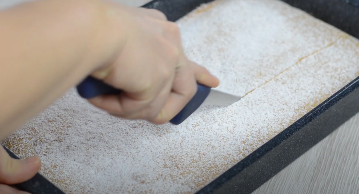 Pekač velikosti 20×35 cm namastimo in pomokamo. Testo razvaljamo med dvema kosoma peki papirja na velikost pekača. Če robovi niso povsem ravni, jih lahko med postopkom s prsti poravnamo.