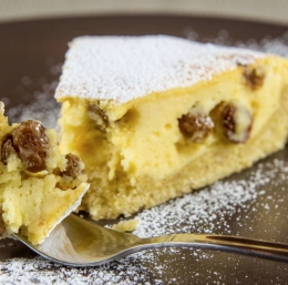 Ko je pecivo pečeno, ga odstranimo iz pečice in pustimo, da se ohladi. Ohlajeno potrosimo s sladkorjem v prahu, narežemo na kose in postrežemo.