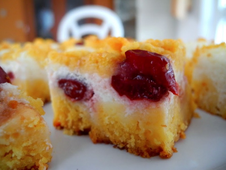 Najprej iz beljakov naredimo trd sneg. Smetano stepemo do kremaste strukture. Pri najnižji hitrosti ji primešamo vse ostale sestavine. Sneg dodamo nazadnje, vmešamo pa ga s kuhalnico. Končan nadev prelijemo na testo in ga nadevamo s svežimi ali zmrznjenimi češnjami. Na vrhu nadrobimo preostanek testa.