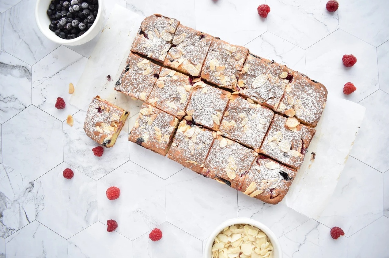 Zmes premešamo in je polovico vlijemo v pekač velikosti 27 x 17 cm. Dodamo sadje po želji in nato drugo polovico zmesi za pecivo. Po vrhu pecivo potresemo z narezanimi mandlji. Pečemo 45–50 minut pri 180 stopinjah.