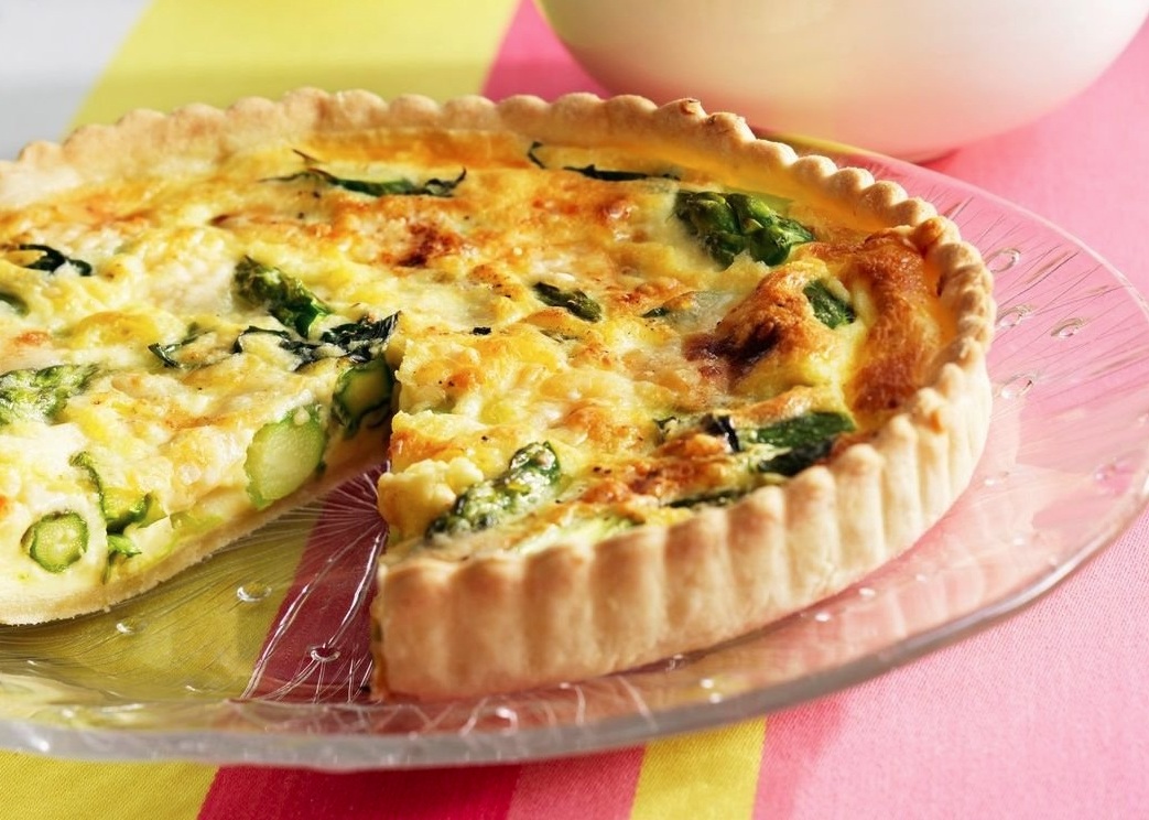 Razžvrkljamo jajca, dodamo smetano, sol, poper, nariban parmezan in popražene šparglje. Zmes nežno premešamo in jo vlijemo v model s testom. Pito pečemo v na 200oC ogreti pečici 40 minut oziroma toliko časa, da se testo in nadev zlato rjavo zapečeta.