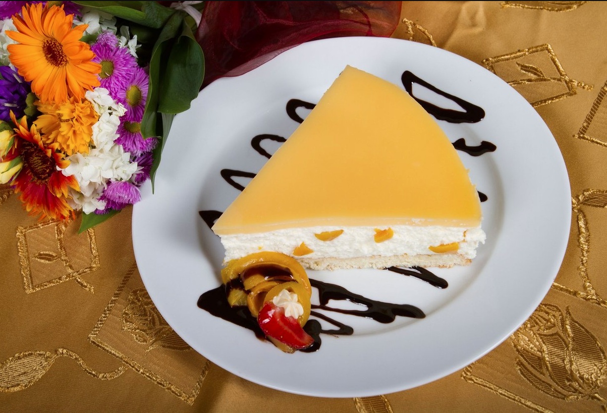 Preden postrežete operite in olupite preostanek breskev, jih prepolovite in narežite na ploske rezine. Tako kot pri priprav kreme tudi tokrat namočite želatino v breskov sok in pripravite na enak način ter potem pustite, da se ohladi. Ko torto vzamete iz zamrzovalnika, po vrhu razporedite breskve in prelijte z želatino. Potem pustite stati čez noč v hladilniku da se vse lepo strdi.