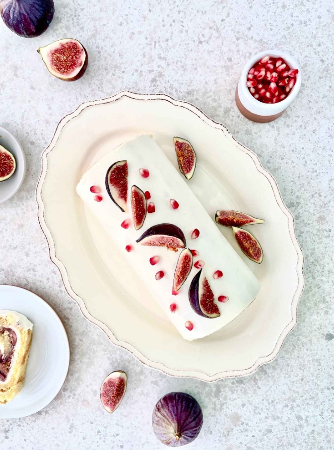 Ohlajeno rolado premažemo s preostankom kreme in jo okrasimo s svežimi figami in s semeni granatnega jabolka.