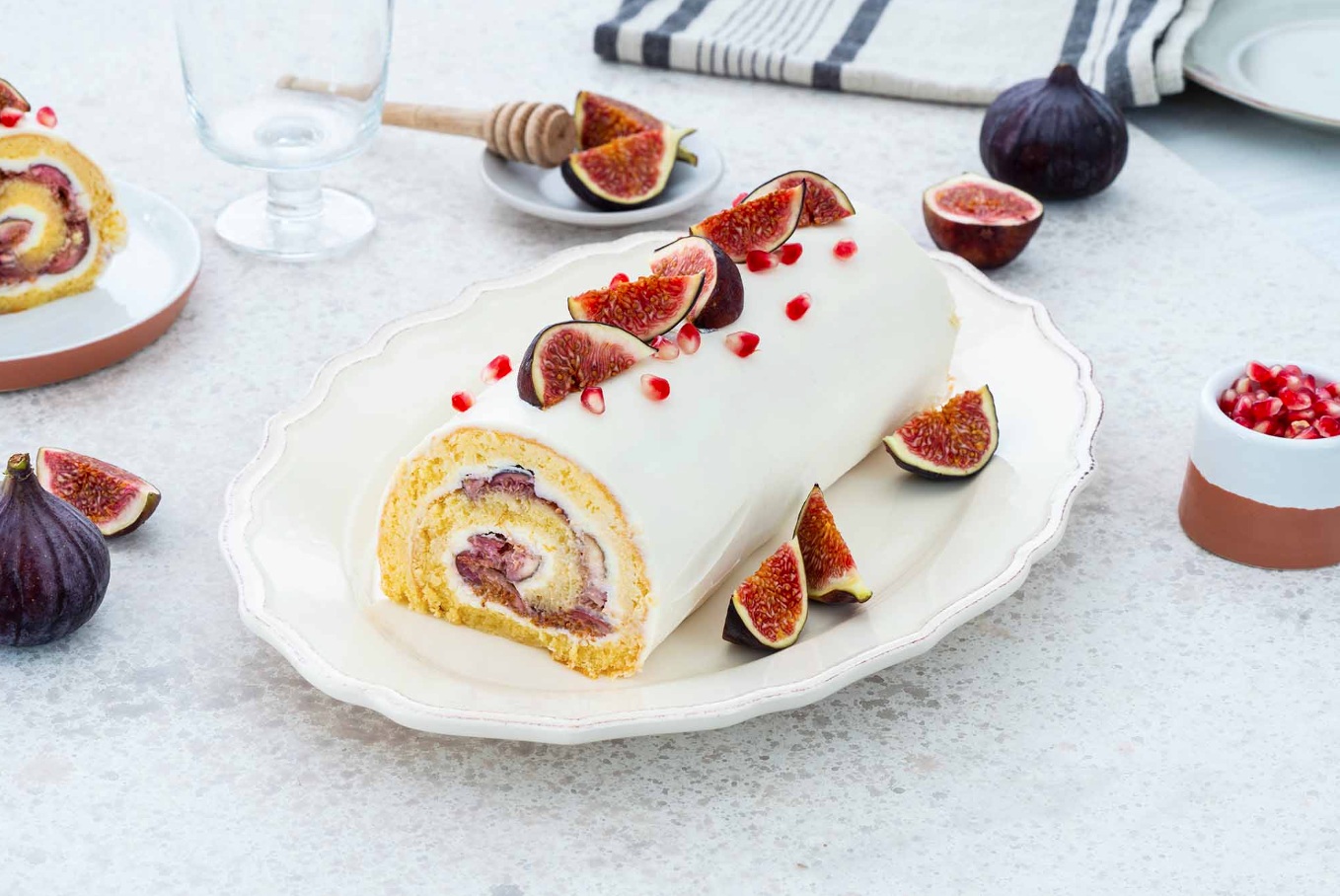 Rolada s figami in medom proslavlja sončno poletje s čudoviti okusi. Medene fige, hrustljavo granatno jabolko in osvežilni grški jogurt ustvarijo zelo okusno sladico.