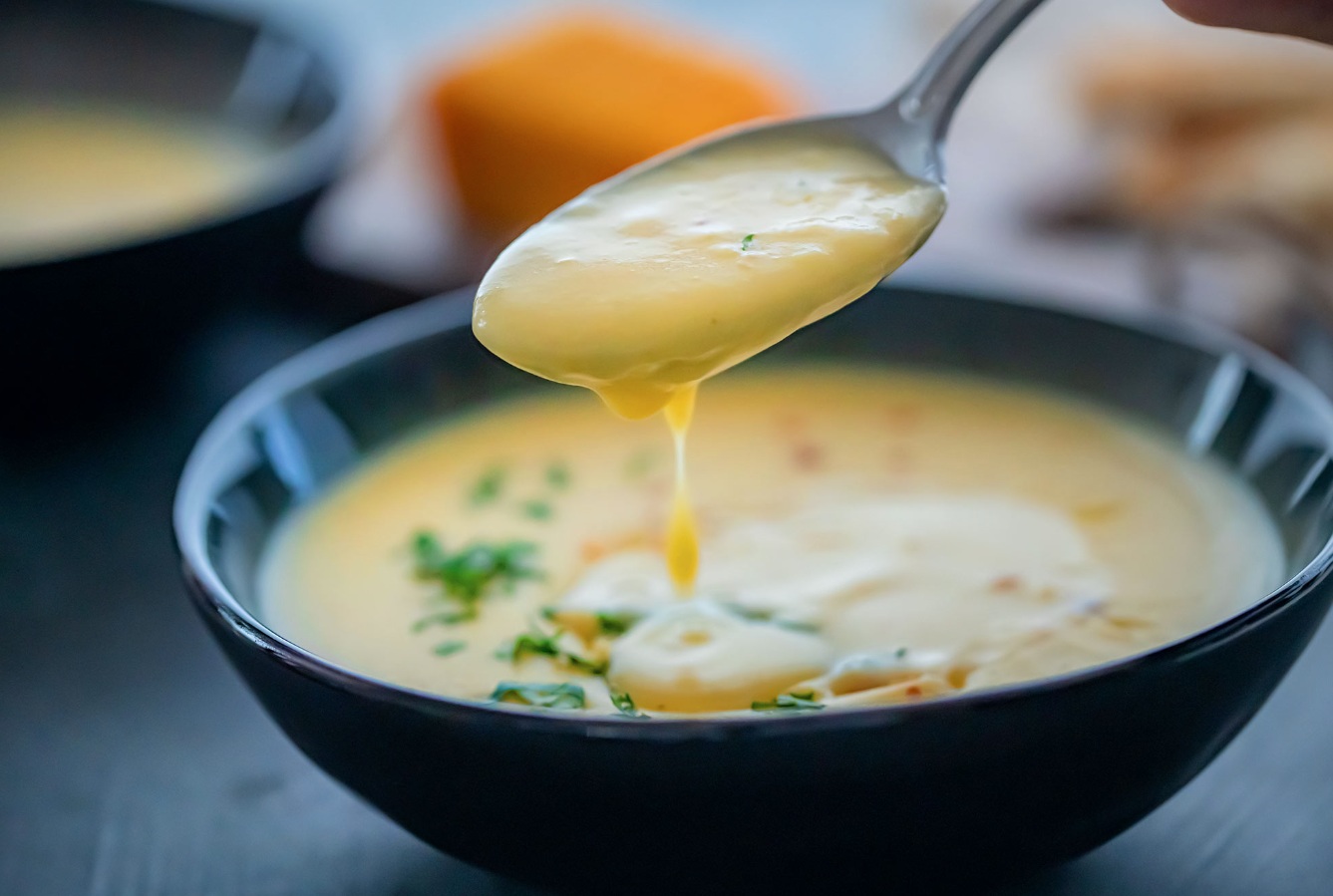 V juho vlijemo mleko in smetano, premešamo in vse skupaj začinimo s soljo, čilijevimi kosmiči, kajenskim poprom ter limetinim sokom. Na koncu vmešamo še nariban sir cheddar in kuhamo 1-2 minuti, da se sir v celoti stopi.
