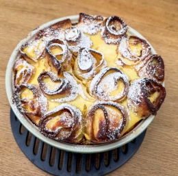Palačinke pečemo na spodnji rešetki 10 minut. Kislo smetano, mleko, 2 jajci in med gladko zmešamo in prelijemo po palačinkah. Pečemo še 25 minut, da se preliv strdi. Pečene palačinke potresemo s sladkorjem v prahu.
