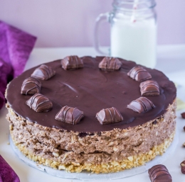 Čokolado stopite v vodni kopeli in jo prelijte po sirovi torti. Takoj po obodu razporedite 12 mini Kinder Buenos piškotov.